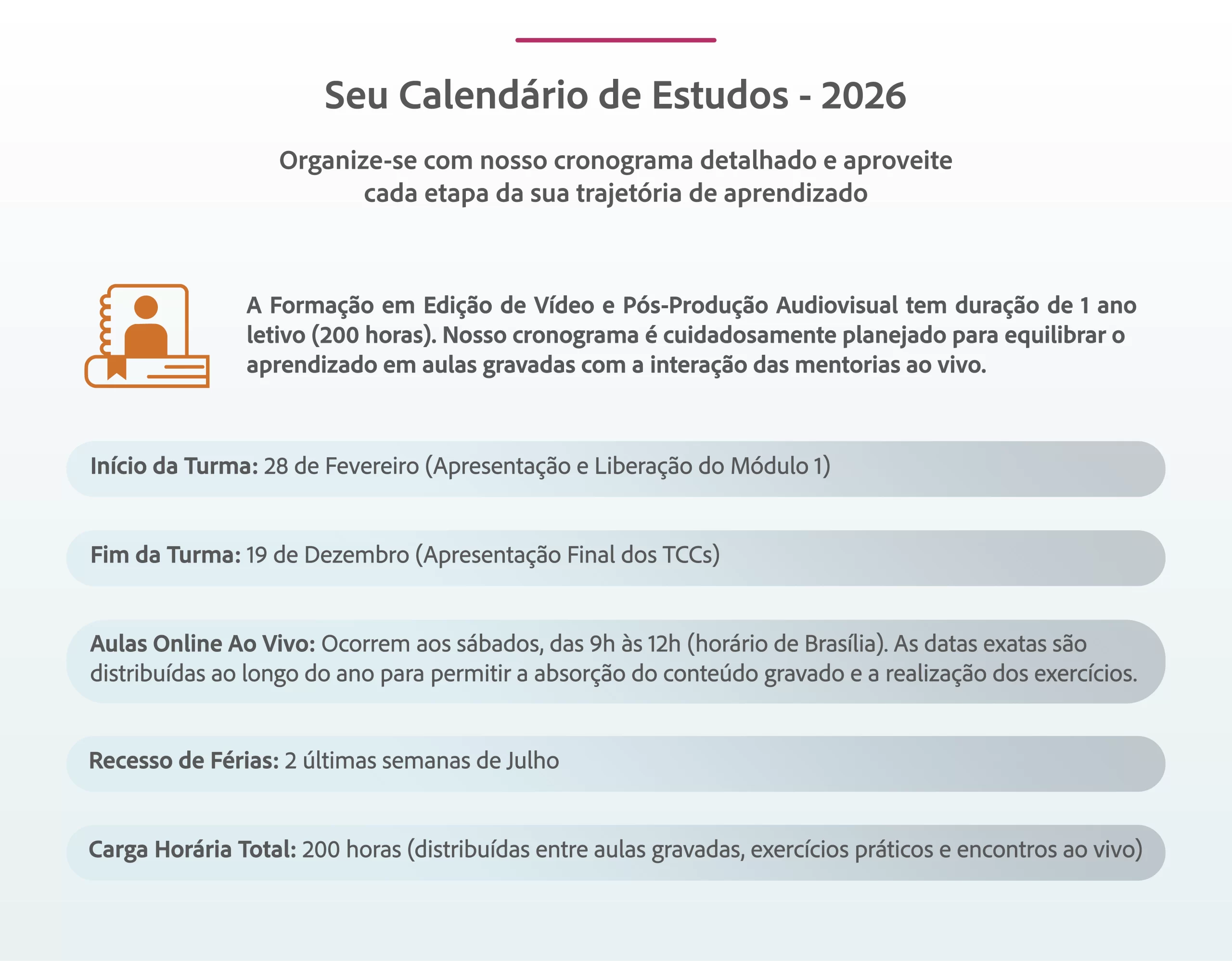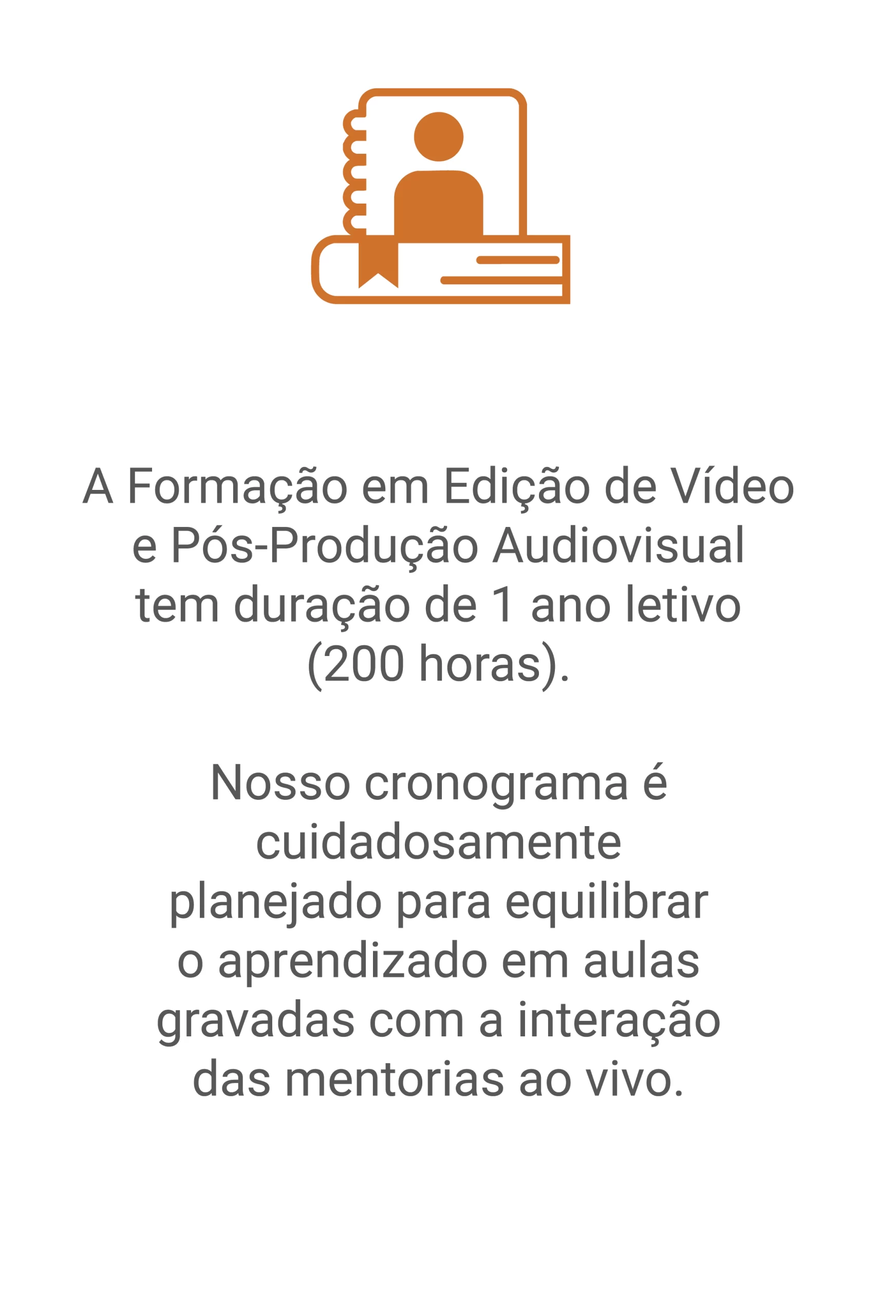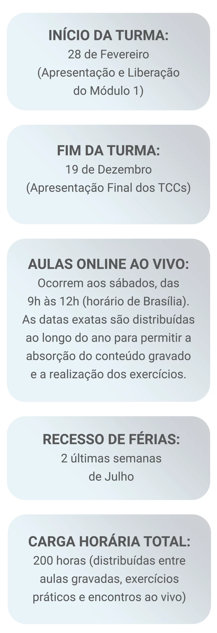 A formação tem duração de 1 ano letivo (200 horas) e é 100% online, com metodologia híbrida. Inclui aulas gravadas (para estudar no seu ritmo), atividades práticas, e encontros ao vivo (sempre aos sábados, das 9h às 12h) para mentoria e discussão. Todas as aulas ao vivo são gravadas e ficam disponíveis aos alunos