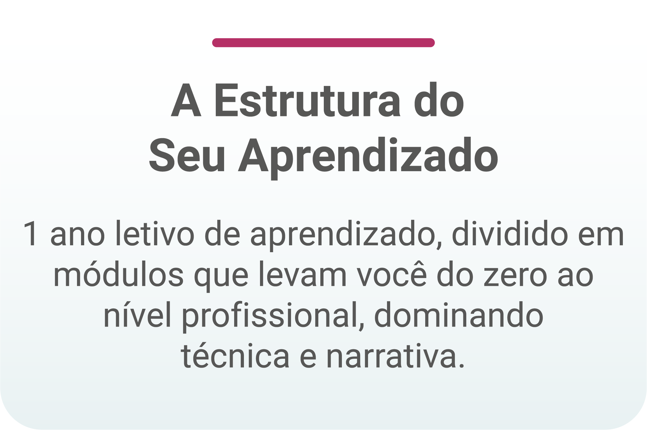 1 ano letivo de aprendizado, dividido em módulos que levam você do zero ao nível profissional, dominando técnica e narrativa.