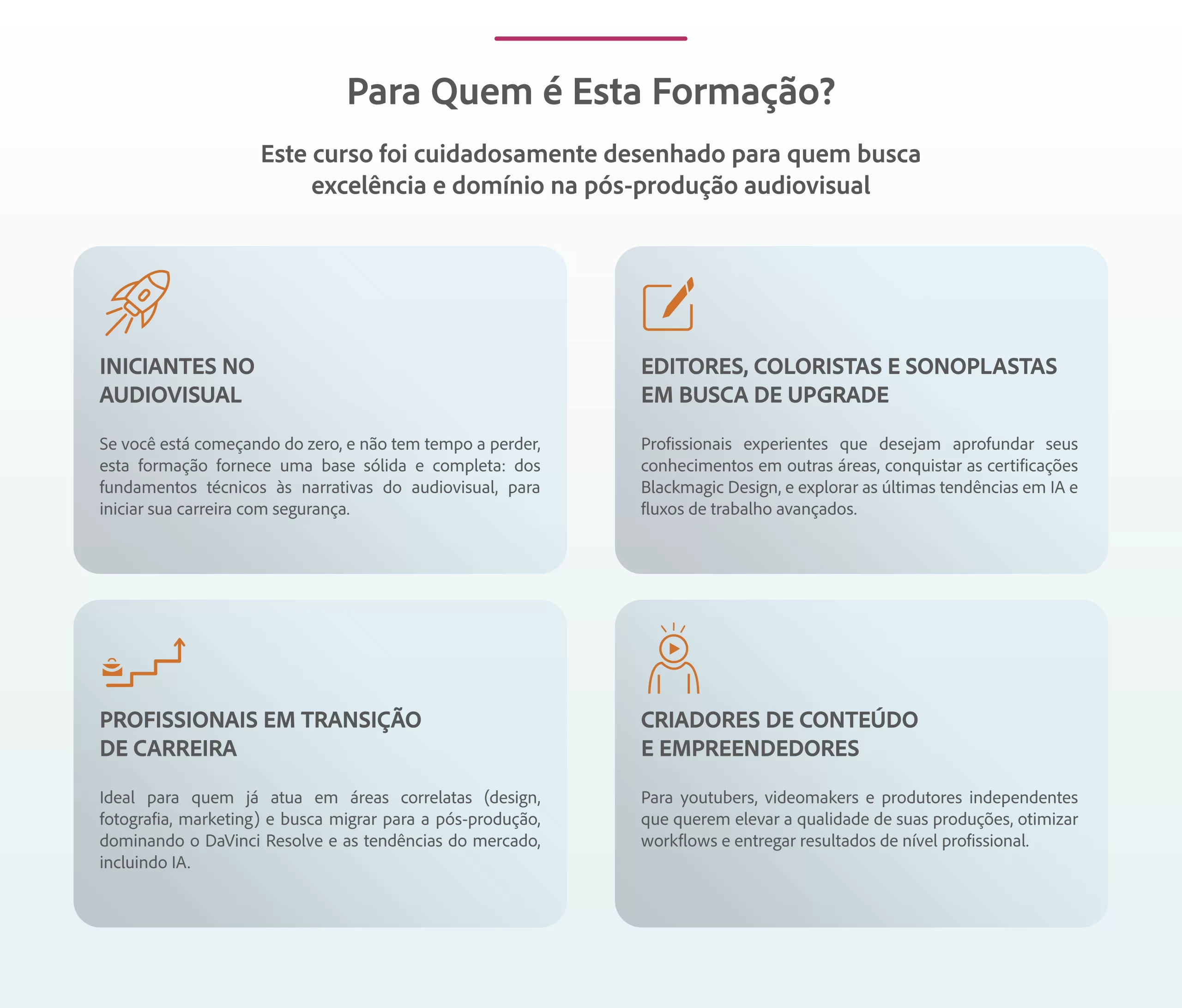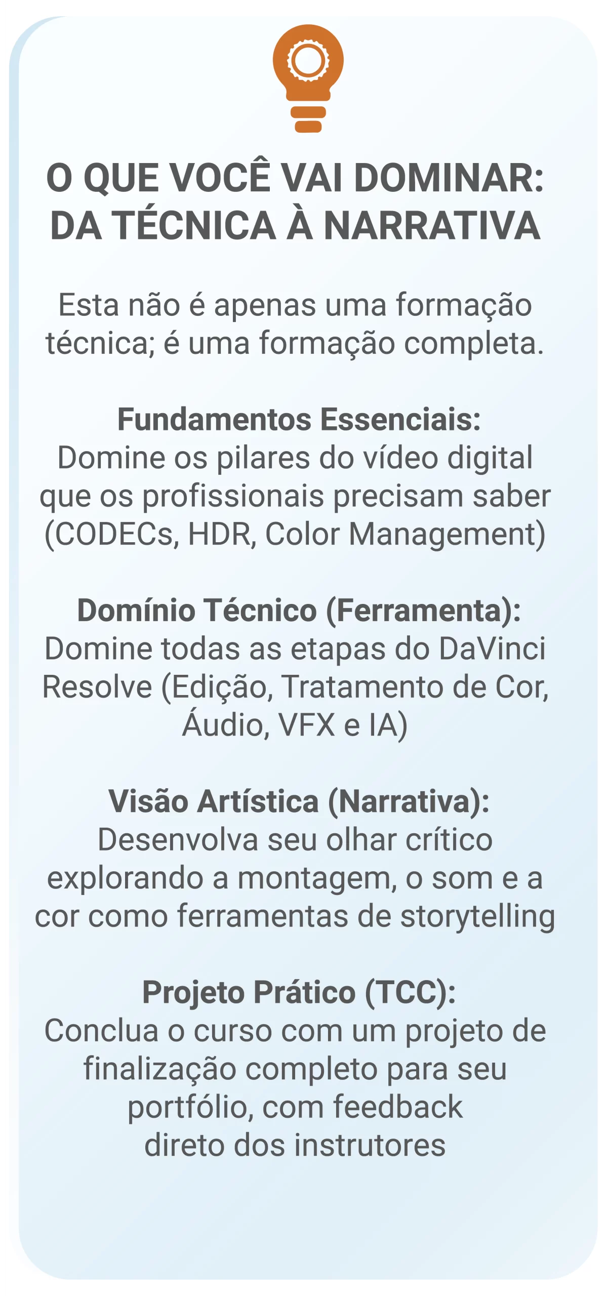 O foco principal da formação é no software DaVinci Resolve, cobrindo todas as suas páginas: Cut, Edit, Color, Fusion, Fairlight e Delivery.