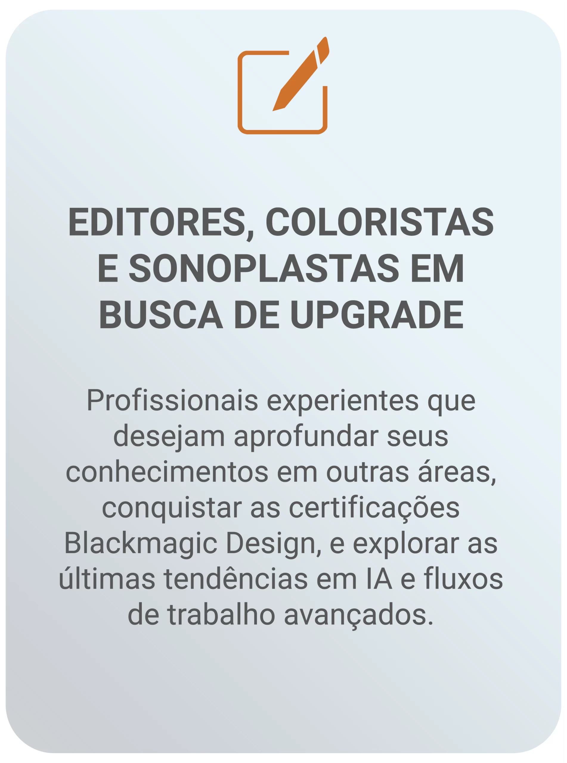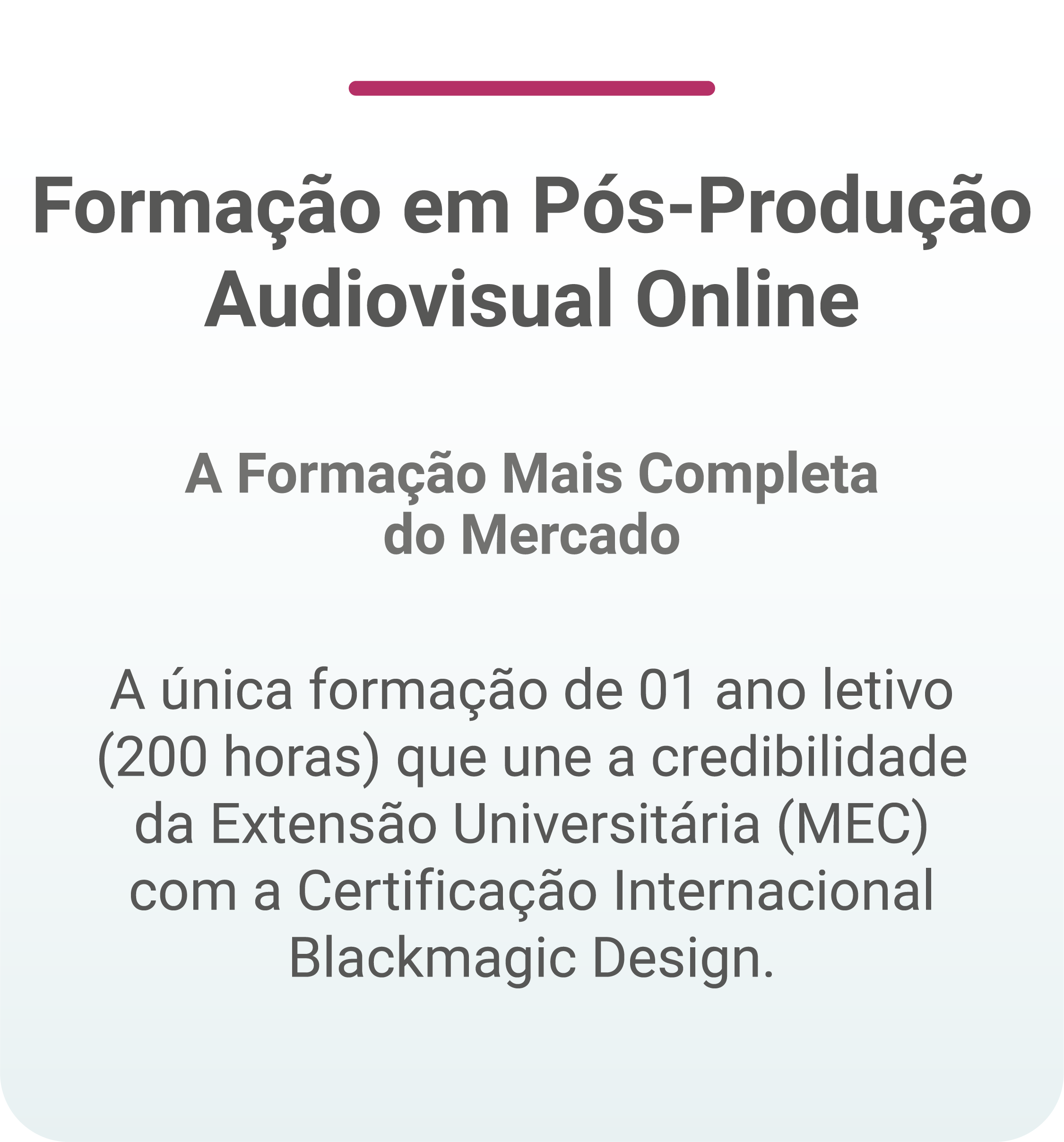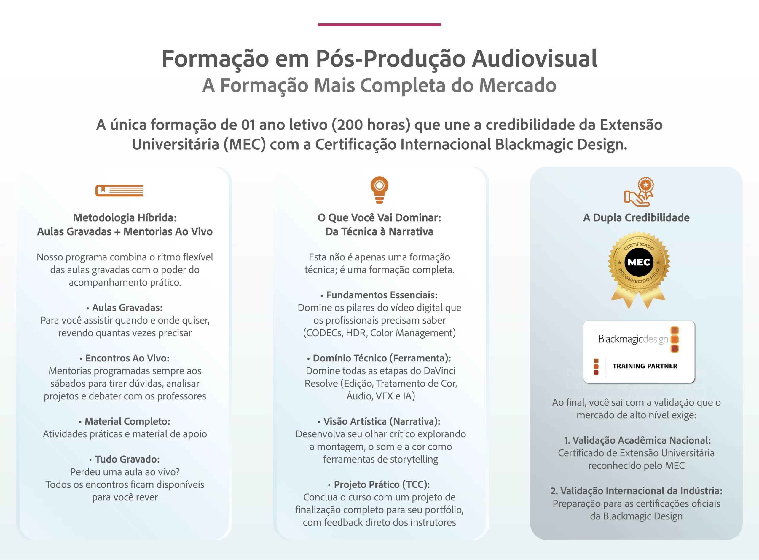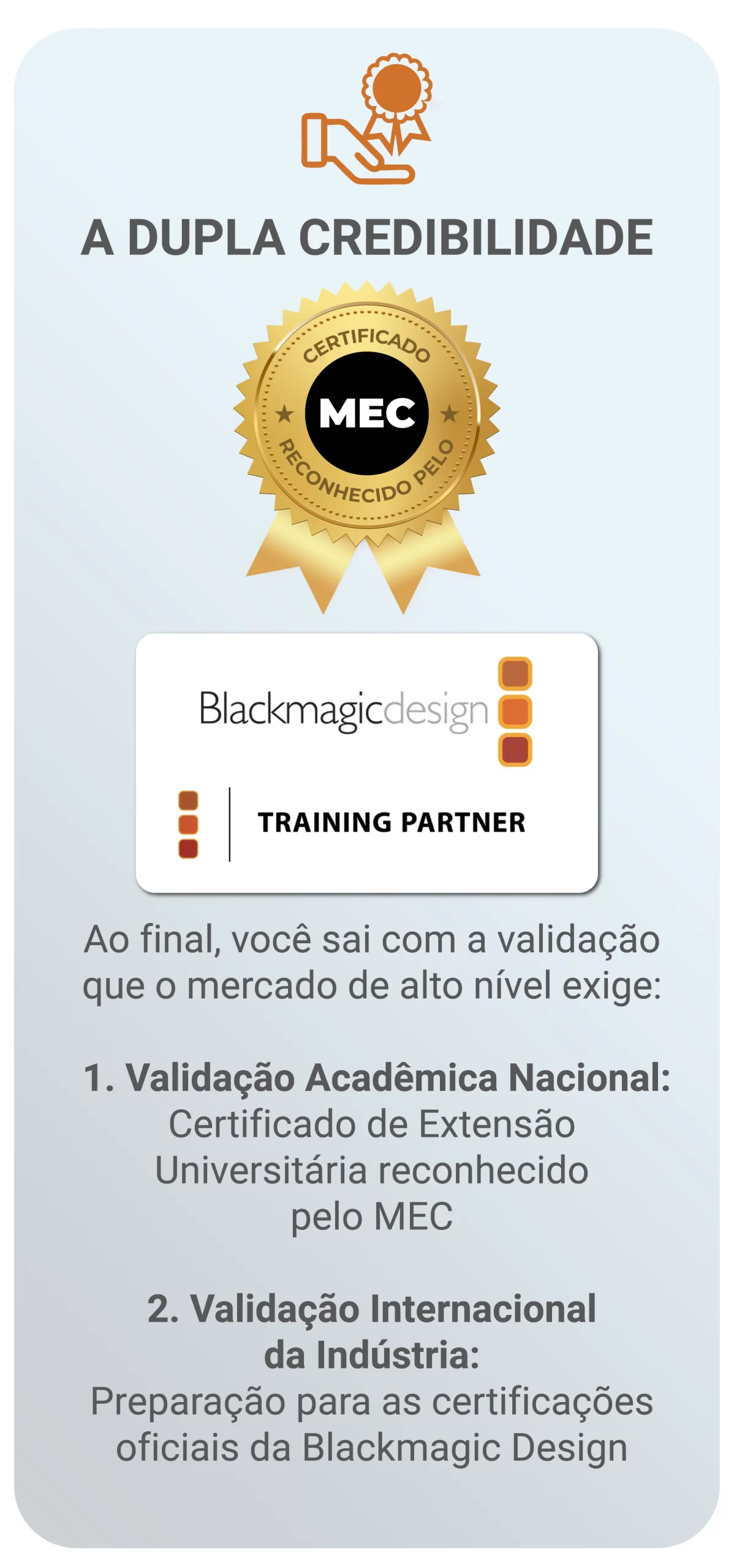 A única formação de 1 ano letivo (200h) que une a credibilidade da Extensão Universitária (MEC) com a Certificação Internacional Blackmagic Design.