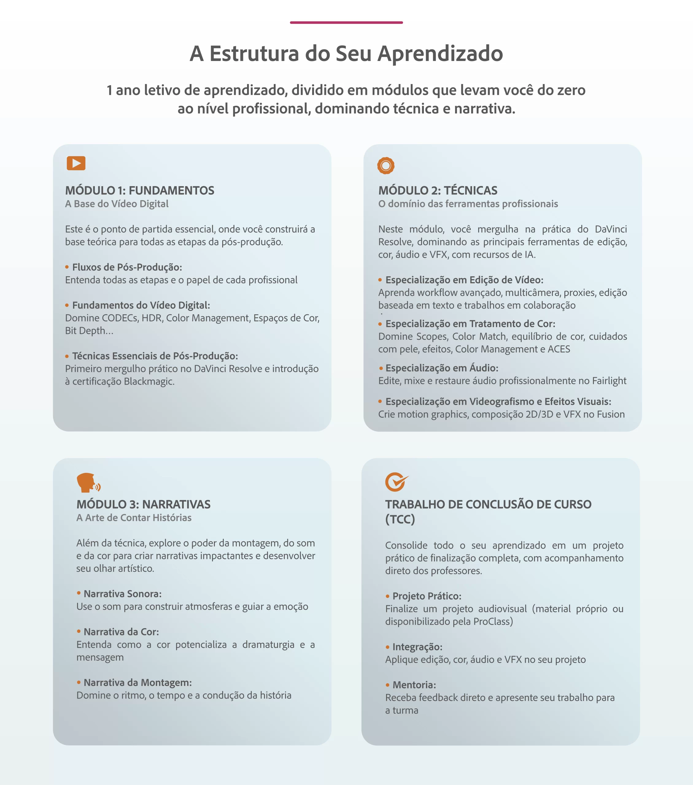 É um curso de extensão universitária de 200 horas, com duração de 1 ano letivo, desenvolvido pela ProClass em parceria com a UNIFATEC. Ele prepara você para dominar todas as etapas da pós-produção audiovisual, desde os fundamentos até as técnicas avançadas de edição, cor, áudio, VFX e Inteligência Artificial, culminando com a dupla credibilidade do MEC e Blackmagic Design.