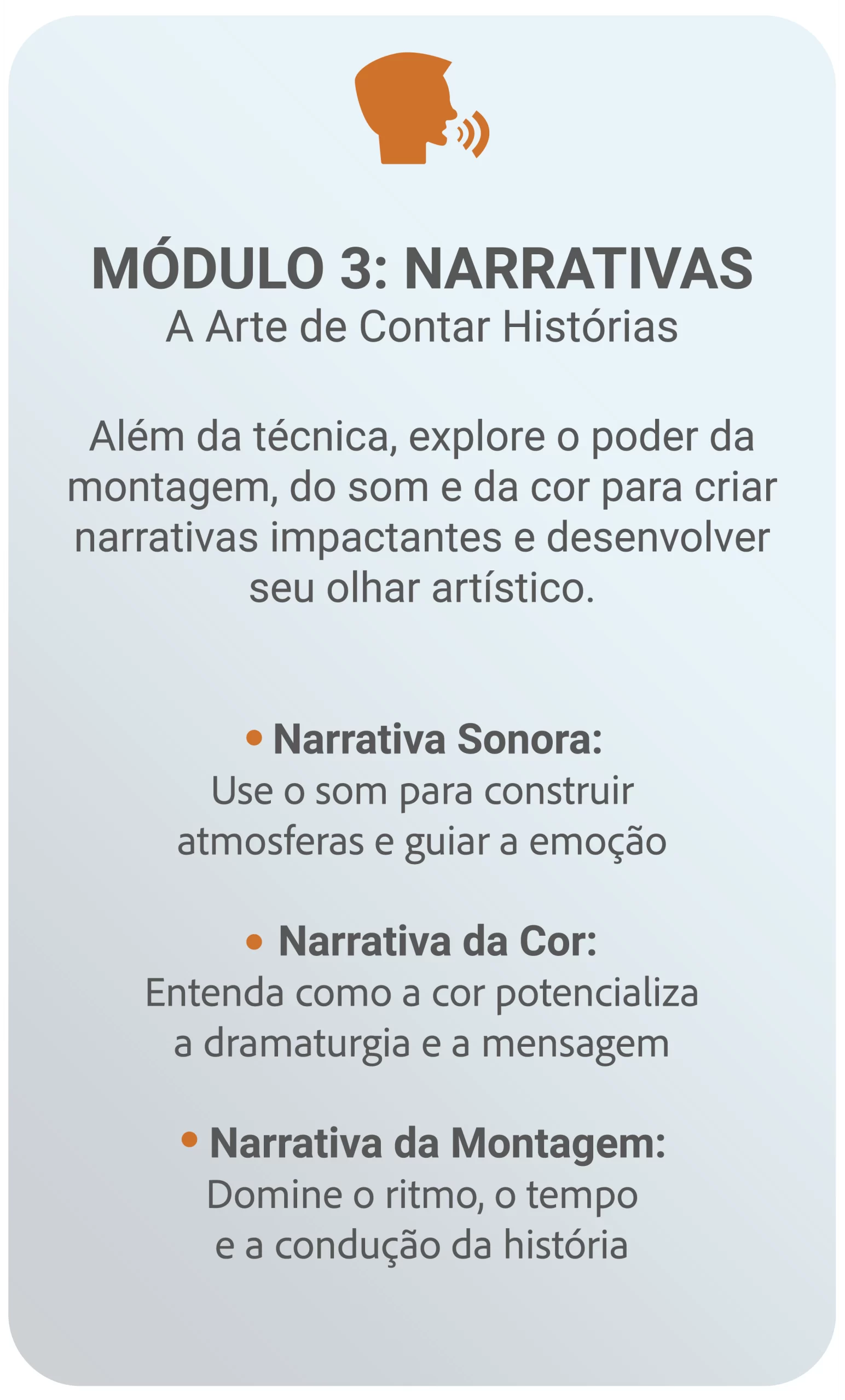Visão Artística (Narrativa): Desenvolva seu olhar crítico explorando a montagem, o som e a cor como ferramentas de storytelling.