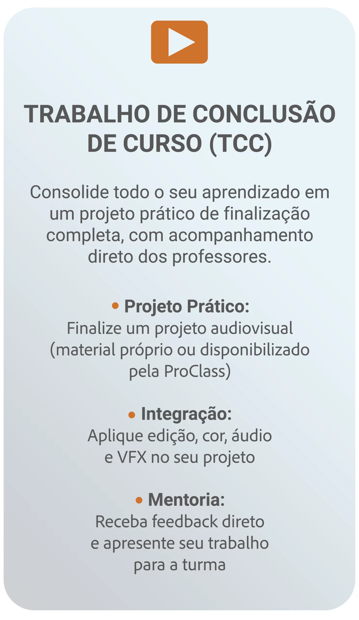 - Projeto Prático: Finalize um projeto audiovisual (material próprio ou disponibilizado pela ProClass).