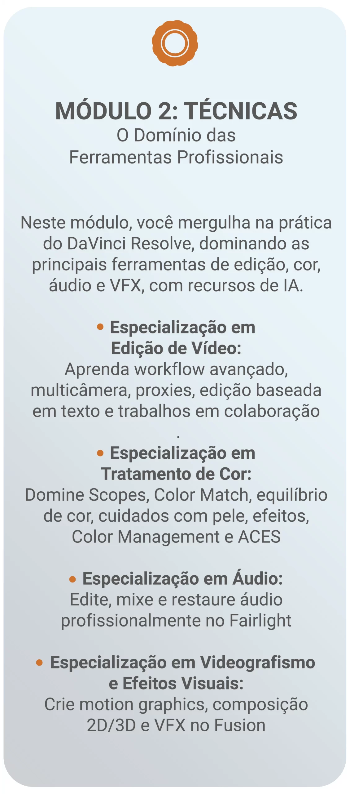 Neste módulo, você mergulha na prática do DaVinci Resolve, dominando as principais ferramentas de edição, cor, áudio e VFX, com recursos de IA.